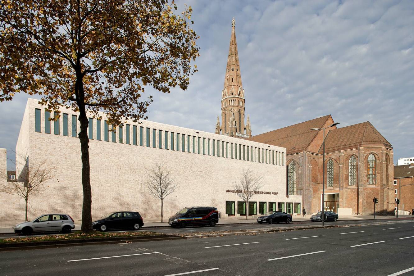 Der Neubau des Musikforums Bochum stellt einen wichtigen öffentlichen Baustein bei der Entwicklung des innerstädtischen Kreativquartiers Viktoriastraße in Bochum dar. Die profanierte, historische Marienkirche ist als zentrales Foyer des Hauses Identität stiftender, städtebaulicher und funktionaler Mittelpunkt des Musikforums. Zu beiden Seiten der Kirche wurden Baukörper angeordnet, die sich unmittelbar an der Länge des Kirchenschiffs orientieren und sich innenräumlich mit diesem verzahnen. Die Höhenentwicklung entlang der Viktoriastraße staffelt sich in Abhängigkeit der innenräumlichen Anforderungen und verleiht dem Gebäude so eine angemessene Maßstäblichkeit im Stadtraum. Auf der Südseite der 1872 errichteten Kirche befindet sich der Konzertsaal der Bochumer Symphoniker mit etwa 1000 Sitzplätzen und hochwertiger akustischer Ausstattung, auf ihrer Nordseite ein flexibel bespielbarer Multifunktionssaal für die Musikschule.
