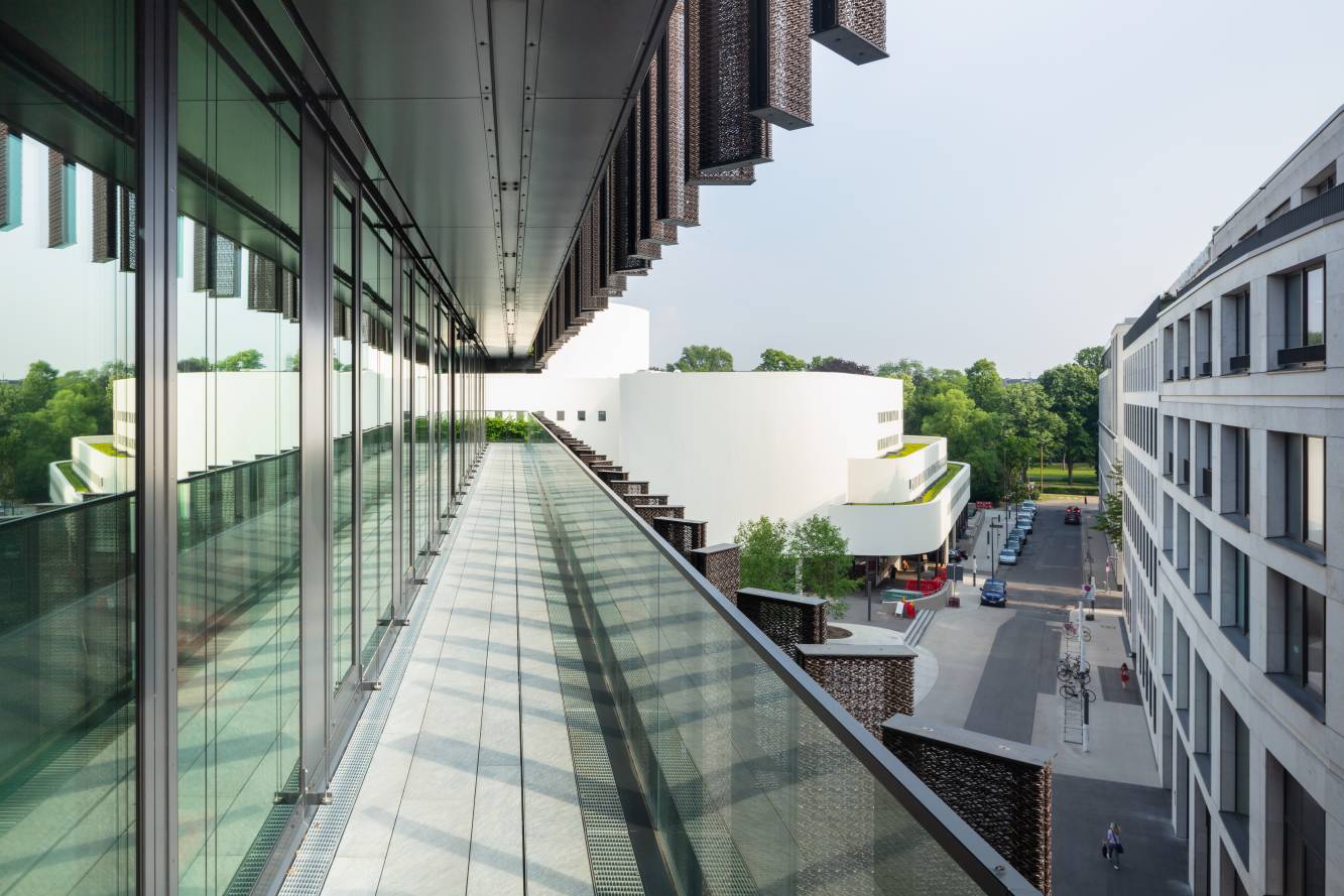 Die besondere Kubatur des neuen zweiteiligen Büro- und Geschäftshauses mit insgesamt knapp 41.000 Quadratmetern Fläche für Einzelhandel, Gastronomie und Büros ist das Ergebnis der städtebaulichen Situation. Die abgeschrägten grünen Fassade des fünfgeschossigen, trapezförmigen Hauptgebäudes bilden zusammen mit dem begrünten Schrägdach des kleineren, dreiecksförmigen Gebäudes einen dynamischen Zugang zum Gustaf-Gründgens-Platz. Nähert man sich von der Schadowstraße oder der Berliner Allee, erhält man freien Blick auf das denkmalgeschützte Nachkriegs-Duo Dreischeibenhaus (1960, HPP Architekten) und das Schauspielhaus (1970, Bernhard Pfau, saniert durch ingenhoven architects) sowie den dahinterliegenden Hofgarten.